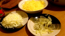 Розподіляємо кетчупом по всій поверхні. Лук маринуємо в оцті з перцем і викладаємо тонким шаром разом з корейскою морквою. Потім йде шар ковбаси, бажано брати вже нарізану тоненкімі скибочками. Затираємо все сиром і ставимо у духовку, розігріту до 220 градусів на 20 хвилин.