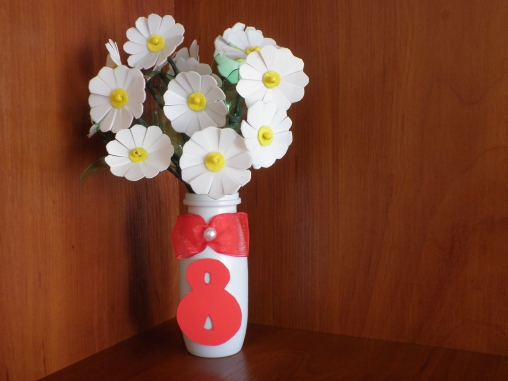 Порібно вирізати з білих пляшок ромашки і закріпити на стеблі. Букет ставимо у "вазочку" з пластикового стаканчику (з-під йогурту).