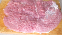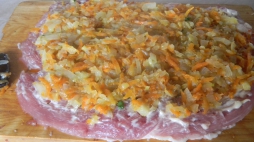 М’якоть свинини розрізати так, щоб отримати велику відбивну. Немає значення вздовж чи поперек волокна різати (в мене не було вибору і я різала вздовж волокон: на смак ніжність м’яса це не вплинуло). Добренько відбиваємо м’ясце, змащуємо легенько майонезом і відставляємо на півгодини. У цей час готуємо начиння: цибулю та моркву дрібно ріжемо/тремо на терку і обсмажуємо. Охолоджуємо. Помідор дрібно ріжемо кубиками і теж обсмажуємо разом з вичавленим часником. Охолоджуємо.