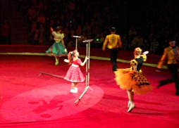 ), коли артист за допомогою спеціального реквізиту (вудки та тарілки) демонструє свою майстерність у розкручуванні тарілок. У стандартному номері артистом розкручується 8-12 тарілок. У виставі «Зірки та Зіроньки» номер обіграли у стилі 60-х років (одяг, музика, головний реквізит – платівки). Використання платівок замість тарілок – найголовніша помилка. Так, платівки відповідають стилю 60-х років, але при цьому втрачається гострота номеру, коли увесь зал переживає і вболіває за артиста, який намагається не впустити жодної тарілки. А платівка що? Впаде, та й впаде. Разом з тим, артистка (карлик/ліліпут) майже нічого не робила крім того, що розкручувала платівки. У всьому світі номер з тарілками розширюють різними цікавими, інколи кумедними, трюками або демонструють майстерність у кількості одночасно розкручених тарілок. А тут номер був побудований більше на хореографії танцюристів, які кружляли у танці навколо головного артиста. Я спостерігала за реакцією глядачів на номер: усі нудьгували. Можливо тільки перший ряд перед самою артисткою ще якось був зацікавлений, а от всі інші – ні. На мою думку, творці цього номеру прогадали, бо він вийшов нецікавим і невидовищним.