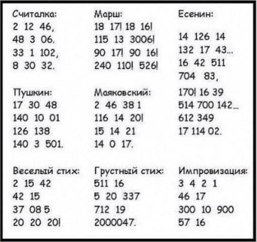 Я уже эту табличку встречала на просторах инета. Интересно, перечитала еще раз у удовольствием. Только называлась она "стихи в цифрах" или как то так -)